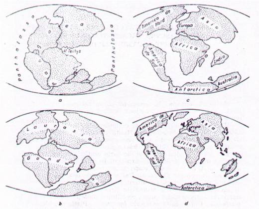 a - in urma cu 200 mil. ani ; b - in urma cu 135 mil. ani; c - in urma cu 65 mil. ani; d - actuala.