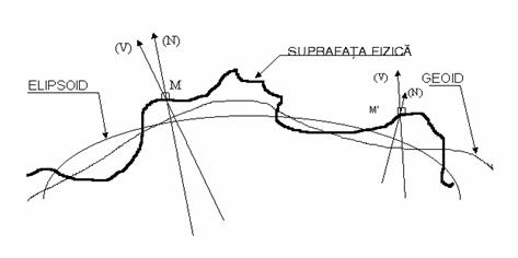 In fig.4 este reprezentata suprafata reala a Pamantului, pe care s-au ales doua puncte arbitrare M si M . Sunt reprezentate de asemenea suprafata geoidului (cu verticala locului V) si suprafata elipsoidului de revolutie (cu normala N).