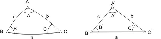 Fig. 3.11. Rezolvarea triunghiurilor elipsoidice mici cu teorema Legendre.