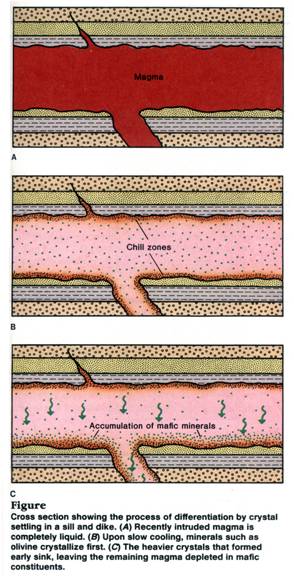 Cea mai semnificativa s-a apreciat a fi diferentierea magmatica asociata cristalizarii fractionate. Astfel, formarea fazelor cristaline din topitura magmatica are loc succesiv, in functie de temperatura de cristalizare, presiunea si compozitia chimica a topiturii.extragerea unei faze cristaline din sistemul magmatic determina, implicit, schimbarea compozitiei chimice a acestuia. Principala cauza care duce la separarea fazelor cristaline de topitura este diferenta de densitate dintre cristale si topitura. Aceasta diferenta de densitate determina o separare gravitationala a fazelor, cu acumularea la baza rezervorului magmatic a celor cu densitate mai mare, mentinerea in suspensie a fazelor cu densitati egale si flotatia spre partea superioara a rezervorului daca densitatea fazei cristaline este mai mica decat cea a topiturii (Fig. 1).