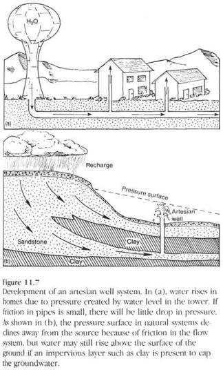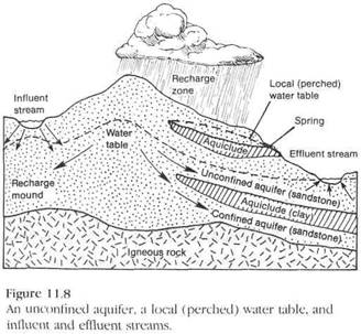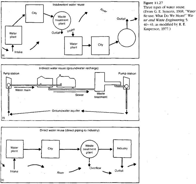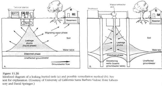 Poluarea unui acvifer poate rezulta din depozitarea deseurilor la suprafata sau in subteran (fig. 11.26 prezinta o asemenea situatie si posibilul remediu). Acest tip de poluare poate proveni si din pomparea in exces a apelor subterane in zona litorala, conducand la infiltrarea apei sarate in acviferele de apa dulce. Apa poluata poate fi tratata pentru refolosire (fig. 11.27).