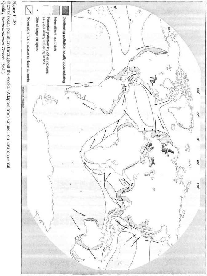Apa este parte integranta a ecosistemelor, alaturi de climat, soluri, consumul de agenti nutritivi. Orice modificare a acestor factori afecteaza ecosistemele. In general populatia se comporta in sensul degradarii ecosistemelor la scara regionala si chiar globala. Conditiile hidrologice, in particular calitatea si procesele specifice apelor de suprafata, devin factori limita in multe sisteme. Chiar si sistemul hidrologic global limita, adica oceanele, se confrunta cu problematica poluarii. Fig. 11.29 prezinta zonele majore de pe glob care evidentiaza poluarea oceanica sau asociata marilor lacuri. Regiunile respective coincid, in linii mari, cu zone puternic industrializate / poluante limitrofe mediului.
