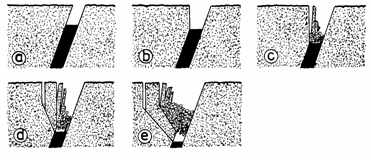 2) Al doilea mecanism este de asemenea progresiv, dar apare ca rezultat al discontinuitatii masei de roci. In acest caz, rocile pot fi destul de tari, incat sa nu se rupa decat solicitate la incovoiere. Mecanismul este controlat de catre discontinuitatile regulate din masa de roci. Ca si in cazul precedent, in spatiul exploatat trebuie sa se mentina un gol suficient de mare pentru ca fenomenul sa se propage pana la suprafata.
