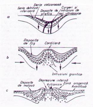 a - individualizarea cuvetei geosinclinale insotita de acumularea de sedimente; b - formarea cordilierelor urmata de eroziune si depunerea depozitelor de flis ; c - faza de orogeneza in care se produce cutarera sedimentelor insotita de depunerea depozitelor de molasa, urmata de formarea depresiunilor intramuntoase si de manifestari vulcanice.