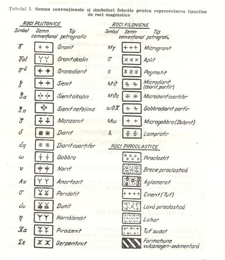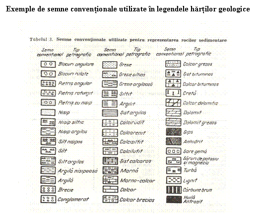 Reprezentarea grafica a datelor geologice cunoscute intr-o regiune data se bazeaza pe utilizarea unei serii de culori, simboluri si semne conventionale. Acestea sunt folosite la realizarea hartilor geologice, iar semnificatia lor se explica sub forma unei legende care se ataseaza hartii geologice. Numarul si tonul culorilor, simbolurile si semnele conventionale variaza de la o harta geologica la alta, in functie de tipurile de roci care trebuie reprezentate, de varsta lor, de gradul de detaliu al cunoasterii geologiei regiunii respective. Acesta este motivul pentru care fiecare harta geologica este insotita de o legenda proprie, valabila si pentru anexele hartii, respectiv pentru coloanele stratigrafice si sectiunile geologice atasate.