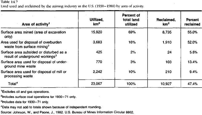 Impactul asupra mediului prin exploatarea resurselor minerale depinde de un complex de factori, dintre care consemnam metodele de extractie, conditiile hidrologice locale, climatul, tipologia rocilor, dimensiunea operatiilor, relieful etc. In plus, impactul variaza cu stadiul de dezvoltare al resurselor. In general, activitatea miniera si de preparare a minereului afecteaza terenul limitrof, atat solul cat si subsolul, aerul, apa si resursele biologice, exacerband si un anume impact social provocat de aparitia asezarilor omenesti si dezvoltarea serviciilor aferente in regiune. Data fiind cresterea consumului si a solicitarii de resurse minerale, se impun solutii de reducere a efectelor negative in-situ si in extindere provocate de poluarea sedimentelor, a apei si a aerului prin actiuni ingineresti / practici de conservare adecvate. Tabelul 14.7 arata relatia intre teritoriul folosit si partea din acesta recuperata prin masuri de protectia mediului.