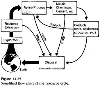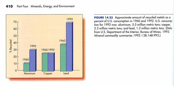 Reciclarea resurselor minerale are unele rezultate pozitive in campania de solutionare a crizei -- scaderea resurselor, cresterea populatiei si a consumului. Metodologia de reciclare trebuie perfectionata, in special la nivelul deseurilor urbane, care pot atinge uneori cote remarcabile (de ex. zacamintele urbane). Fig. 14.25 prezinta ciclul resurselor, iar Fig. 14.26 valoarea materialului reciclat raportata la consumul total de metal din SUA in ultimele doua decenii.