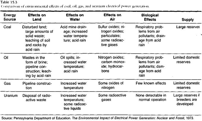Fisiunea nucleara este o importanta sursa de energie, in special in multe tari dezvoltate. Totusi aceasta activitate nu prolifereaza excesiv, datorita riscurilor de disfunctie si poluarea mediului (de ex. Cernobal), ca si a costului ridicat solicitat de construirea reactoarelor. Tabelul. 15.3 arata comparativ efectele de degradare a mediului prin surse conventionale si nucleare.