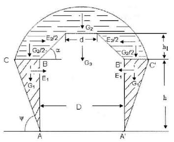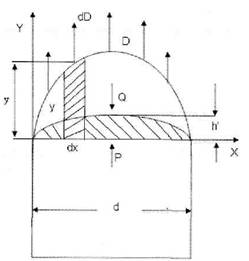 Autorul considera ca, in conformitate cu aceasta ipoteza, greutatea rocilor care se gasesc deasupra excavatiei si care sunt cuprinse in interiorul unei bolti de echilibru (Q), trebuie sa fie echilibrata de rezultanta componentelor verticale (D) ale fortelor de coeziune ale rocii sau substantei minerale utile, forte care se manifesta ca niste rezistente la tractiune care actioneaza de-a lungul boltii de echilibru, fig.5.1.
