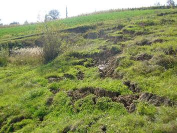 Portiunea de drum studiata este afectata de alunecari de teren pe o portiune de aproximativ 120m. In amonte de drum a existat in trecut un iaz care a fost asanat si umplut cu material (argila prafoasa). Nu au fost identificate sisteme de drenaj al apei.