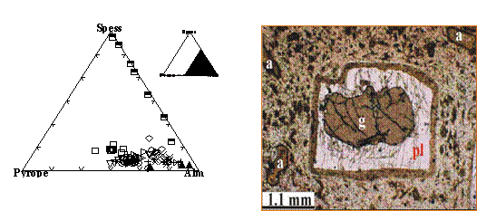 Fig. 3.3B - Granatii apar ca fenocristale fara incluziuni, cu conture euhedrale si subhedrale, uniformi in compozitie: domina almandinul (48-60%) subordonat pirop (18-27%); grossular + andradit (13,8-17,3 %); spesartin (7,6-10,6%).Mg=23-28. in fenocristalele de granat nu exista variatii compozitionale intre "inima si zonele periferice" ale acestora. Parametrii fizici (i.e indice de refractie =1.794 si cell edge =11.552 (+ 0.007 A) indica deasemeni compozitii bogate in almandin. Granatii sunt inconjurati sau "inchisi" in fenocristale de plagioclaz.