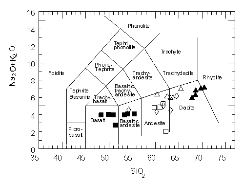 Diagrama TAS (LeMaitre, 1989)(Fig.3.6.) pentru intreaga suita de roci intruzive analizate arata ca cele mai bazice roci sunt cele din valea Haita (aria calderei Calimani, iar cele mai acide sunt dacitele de Dragoiasa; rocile in a caror evolutie au intervenit procese de 'amestec de magme '(insotite sau urmate de contaminari) sunt amplasate in campuri 'evazive' fie de andezite fie de dacite;