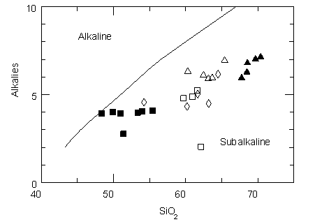 In diagramele: alkalii/SiO2 (Fig. 3.8.) si diagrama CaO/( Na2O + K2O) (Fig. 3.9.) se remarca o trasatura comuna clara a tuturor rocilor si anume caracterul lor sub-alkalin;
