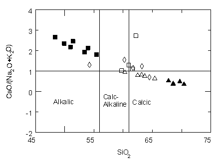 Fig. 3.9. - Diagrama CaO/(Na2O+K2O) vs. SiO2 pentru rocile magmatice din