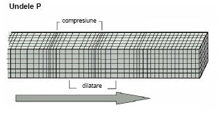 -Undele P sau undele primare numite si unde de compresie sau unde longitudinale. Deplasarea pamantului care acompaniaza trecerea lor se face prin dilatatii si compresii succesive. Ele se deplaseaza paralel la directia de propagare a undei. Acestea sunt cele mai rapide (6 km.s-1 aproape de suprafata) si sunt primele inregistrate de seismografe. Ele sunt responsaibile de bubuitul care il putem auzi la ineputul unui cutremur.