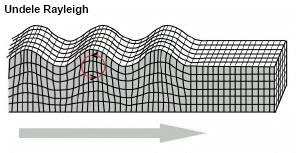 -Unda lui Rayleigh: ea a fost descoperita de John William Strutt Rayleigh in 1885. Miscarea ei este complexa, Asemanatoare ca acea unui pulbere purtat de un val, constituind o miscare verticala si orizontala.