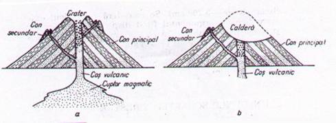 a - elementele unui aparat vulcanic ; b - caldera.