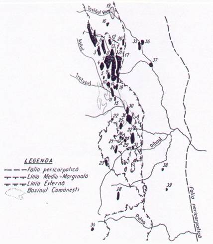 Fig.100. Srtructurile gazeifere si petro-gazeifere din Subzona Flisului Paleogen si Zona Miocena din Moldova: 1 - Geaman; 2 - Gropile lui Zahanache; 3 - Chilii-Vest; 4 - Tasbuga; 5 - Tasbuga -Sud; 6 - Chilii-Est; 7 - Cilioaia-Vest; 8 - Zemes; 9 - Moinesti-Vest; 10 - Leorda; 11 - Comanesti; 12 - Arsita; 13 - Foale-Tazlau-Modarzau- Piatra-Crapata - Moinesti-Oras; 14 - Vasiesti-Vest; 15 - Darmanesti; 16 - Frumoasa; 17 - Solont-Uture- Moinesti-Oras; 18 - Vaisesti-Est; 19 - Tazlaul Mare; 20 - Mihoc; 21 - Cucuieti; 22 - Doftenita; 23 - Slanic Bai; 24 - Nineasa; 25 - Pacurita; 26 - Cerdac-Vest; 27 - Cerdac-Centru; 28 - Lepsa; 29 - Cerdac-Est; 30 - Larga; 31 - Doftana; 32 - Slanic; 33 - Fierastrau; 34 - Ghelinta; 35 - Campeni-Vest; 36 - Campeni; 37 - Tescani; 38 - Casin; 39 - Campuri.