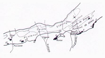 Fig.101. Structurile petro-gazeifere si gazeifere din Pintenul de Homoraciu, deValeni, Cuveta de Drajna si de la contactul zonei miopliocene cu Pintenul de Valeni : 1 - Izvoarele ; 2 - Posesti ; 3 - Carbunesti ; 4 - Surani ; 5 - Predeal-Sarari ; 6 - Opariti ; 7 - Copaceni ; 8 - Cosminele ; 9 - Bustenari ; 10 - Varful Draganesei ; 11,12 - Varfuri-Visinesti ;13 - Vulcana ; 14 - Starmini.