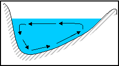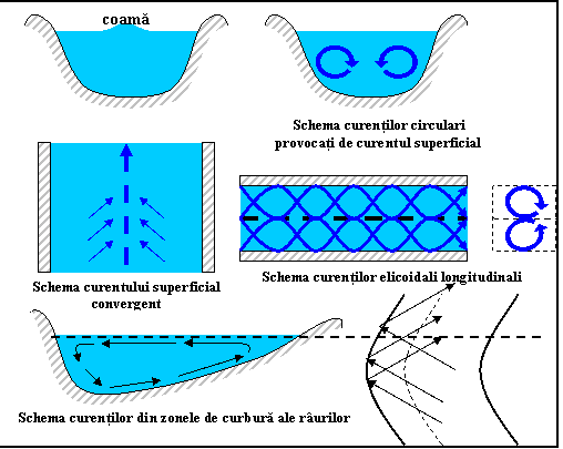 vectorul viteza, in fiecare punct al curentului de apa, are o directie variabila ce tinde, sub unghiuri diferite, spre directia principala a cursului de apa; de aici deplasarea in vartejuri;