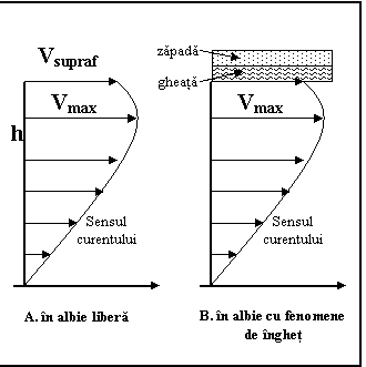 Fig. nr. 7 Epura (hodograful) vitezelor in albie libera (A) si cu fenomene de inghet (B)