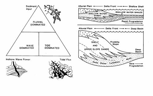 * echilibrul depozitional care se stabileste intre aportul de aluviuni si aportul de sedimente deplasate de valuri si maree, determina geometria sistemelor deltaice si distributia faciesurilor in trei subsisteme distincte (vezi si fig. 12.16):