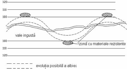 1. Raurile sinuoase fara evolutie in plan se intalnesc in regiunile de munte, cand forma sinuoasa a rezultat prin procese geologice vechi sau datorita strabaterii unor defilee in terenuri foarte tari. De asemenea, si raurile regularizate au forma sinuoasa dar fara evolutia albiei in plan.