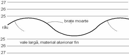 2.b Rauri sau sectoare de rauri cu meandrare libera - au albia sapata in sedimente usor erodabile si intr-un strat suficient de gros. In zonele de ses vaile sunt largi - albii largi cu lunci si terase.