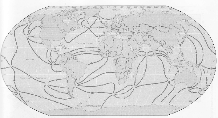 Predictii idealizate asupra mareelor             Pentru a prezice modele ale mareelor pentru Pamantul ideal, acoperit de apa trebuie sa ne intoarcem la declinatie. Declinatia lunii determina pozitia fluxului. Exemplul ilustrat in figura 1-