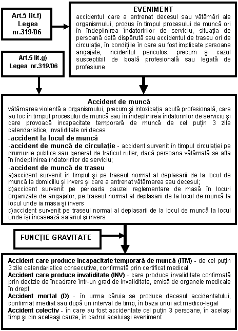Art.5 lit.g) - Accident de munca - vatamarea violenta a organismului, precum si intoxicatia acuta profesionala, care au loc in timpul procesului de munca sau in indeplinirea indatoririlor de serviciu si care provoaca incapacitate temporara de munca de cel putin 3 zile calendaristice, invaliditate ori deces;