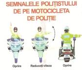 In afara semnalelor regulamentare din intersectii, de pe motocicleta sau din autovehicul, politistul poate dirija circulatia si prin semne specifice, care pot preciza traiectorii impuse, locuri de oprire, repunerea in miscare, iesirea unui vehicul dintr-un rand, ocolirea unor obstacole, etc., oprirea vehiculelor este obligatorie si la semnalele date de urmatoarele categorii de persoane, care trebuie echipate si amplasate astfel incat sa poata fi observate si recunoscute cu usurinta de participantii la trafic: