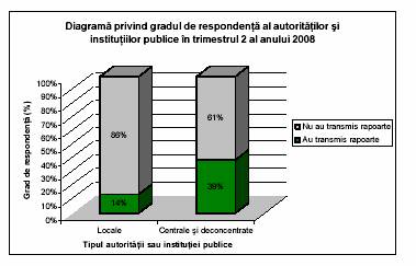 Desi nu a fost stabilit un indicator specific, pe baza evaluarii generale asupra rezultatelor procesului de raportare corespunzator ambelor trimestre este indicat faptul ca, sub aspectul gradului de participare la procesul de raportare a autoritatilor si institutiilor publice in functie de categoria din care fac parte, se remarca urmatoarea tendinta: