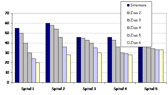 Asa cum este de asteptat, punctajul mediu APACHE descreste de la ziua 1 la ziua 6, indicand faptul ca a existat o ameliorare a starii pacientului datorata ingrijirii. Totusi, exista diferente in profilurile fiecarui spital, incluzand urmatoarele: