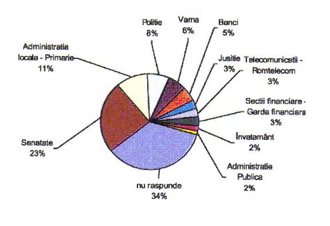 Pentru determinarea modului in care populatia Capitalei percepe amploarea fenomenului coruptiei, respondentilor li s-a cerut sa raspunda la intrebarea: ' in ce masura considerati ca luarea de mita este raspandita in Romania?' Opinia dominanta (84,4%) este aceea ca toti sau cei mai multi functionari primesc mita (fig. 1). Peste 7% dintre respondenti au preferat o varianta de raspuns mai nuantata ('doar functionarii din anumite domenii iau mita') si au precizat urmatoarele domenii principale in care se manifesta luarea de mita: