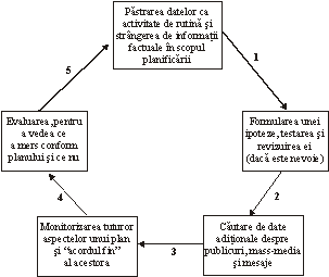 Cercetarea incepe ca un studiu de rutina pentru a asista planificarea in relatiile publice, continua cu testarea si revizuirea opotezelor, necesita o cautare ulterioara de date si evaluarea metodologiei; se muta inspre monitorizarea programelor de lucru si se termina cu o evaluare a planului de relatii publice, care furnizeaza informatii in scopul de ajuta planificarea ulterioara, completand, astfel, ciclul (dar si luandu-l de la capat)