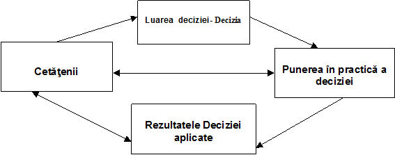 Cetatenii determina luarea deciziei. Dupa ce decizia este luata, ea este pusa in practica. Cetatenii verifica corectitudinea punerii ei in practica. Punerea in practica a deciziei are ca efect obtinerea unor rezultate, rezultate care determina anumite schimbari care se rasfrang asupra cetateanului. Cetateanul intervine in toate fazele. Imaginati aceasta schema.