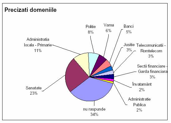 Pentru determinarea modului in care populatia Capitalei percepe amploarea fenomenului coruptiei, respondentilor li s-a cerut sa raspunda la intrebarea: " In ce masura considerati ca luarea de mita este raspandita in Romania?" Opinia dominanta (84,4%) este aceea ca toti sau cei mai multi functionari primesc mita (fig. 1). Peste 7% dintre respondenti au preferat o varianta de raspuns mai nuantata ("doar functionarii din anumite domenii iau mita") si au precizat urmatoarele domenii principale in care se manifesta luarea de mita: