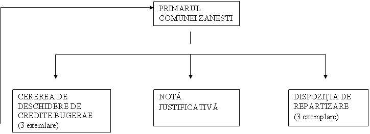 De la Primaria Zanesti se repartizeaza credite bugetare spre ordonatorii subordonati . Dispozitiile generale de repartizare se trimit la Trezoreria Finantelor Publice Bucuresti, unde se procedeaza la trecerea sumelor din contul primariei in contul ordonatorului subordonat, acest lucru realizandu-se la unitatile Trezoreriei din teritoriu, in raza carora se afla ordonatorii de credite .