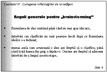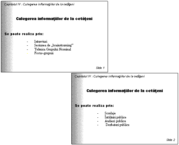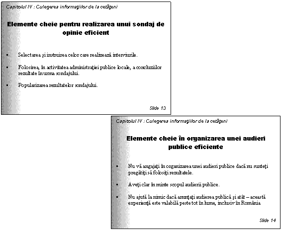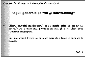 colectare info: Dupa 40 de minute, grupurile sunt invitate sa prezinte pe rand, in plen, rezultatele discutiilor, pe planse scrise. Dupa prezentarea grupurilor, facilitati o discutie care sa faca o comparatie intre rezultatele prezentate concluzionand pe principiile generale si aplicabile ale consultarii publicului.