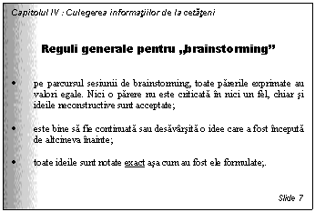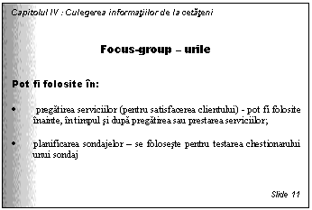 colectare info: Fiecare grup va elabora un chestionar pe baza modelului anexat si a intrebarilor continute in prezentarea situatiei. Dupa 30 de minute, grupurile isi aplica chestionarele unul altuia (grupul A il aplica pe grupul B, Grupul B pe grupul C, etc.). Sesiunea aplicativa dureaza tot 30 minute. In timpul ramas, ultimele 30 minute, grupurile vor analiza in plen modul in care chestionarele au fost utile si relevante pentru scopul propus;