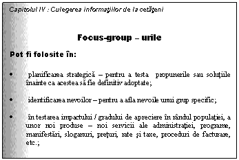 Focus-grupurile reprezinta o modalitate relativ simpla, rapida si ieftina de a avea un feedback din partea cetatenilor. Ele pot fi folosite intr-o varietate de situatii, ca de exemplu: