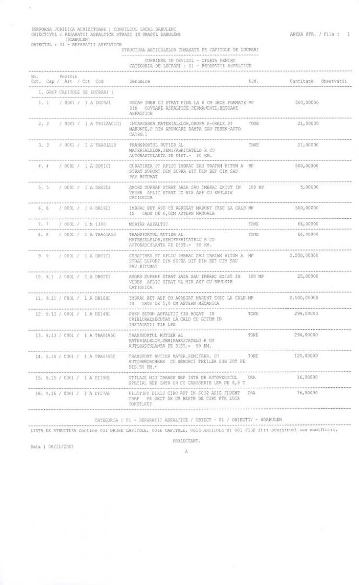 II.2.1) Total cantitati / prestatii servicii / lucrari (se vor include eventuale suplimentari si optiuni, daca exista) Scopul acestui contract il reprezinta executarea lucrarilor de asfaltare a strazilor din orasul Dabuleni. Cantitatea de lucrari care se vor executa este prezentata in listele de cantitati stabilite la intocmirea SF. Mentionam ca se pot achizitiona noi lucrari de suplimentare cu 50% a cantitatilor specificate. |