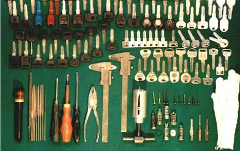 sub pardoseala cabinei, portbagajului, a compartimentului motor se gasesc scule ce pot fi utilizate pentru confectionarea de chei false, se gasesc chei brute (Fig. ) si documente in alb;
