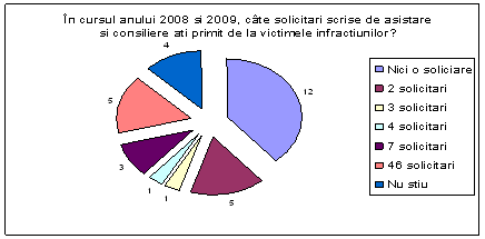 Astfel, un numar de 12 consilieri nu au primit nici o solicitare scrisa de asistare si consiliere de la victimele infractiunilor, 5 consilieri declara ca au primit in cursul anilor 2008, 2009 un numar de 46 de solicitari, 5 consilieri au primit cate doua solicitari, 4 consilieri au bifat raspunsul "nu stiu", un numar de 3 consilieri declara ca au primit sapte cereri de asistare si consiliere, un singur consilier a primit patru solicitari si un alt consilier a primit trei solicitari de asistare si consiliere din partea victimelor infractiunilor.