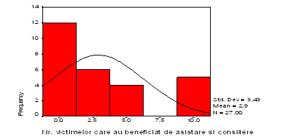 Dintre victimele infractiunilor care au solicitat in scris asistare si consiliere, media celor care au beneficiat este de 2,85. Din studiul histogramei de mai jos rezulta ca: un numar de 12 consilieri afirma ca nu au avut nici un beneficiar de asistare si consiliere, 6 consilieri afirma ca au avut ca si beneficiari de asistare si consilieri un numar de cel mult 3 persoane, un numar de 4 consilieri afirma ca un numar de 9 victime au beneficiat de asistare si consiliere si un altii patru declara ca au avut ca si beneficiari un numar de cel mult 5 persoane.