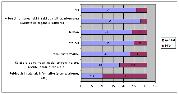 Cat despre modalitatea de informare a victimelor infractiunilor cu privire la serviciile furnizate si la programele de asistenta si consiliere care se desfasoara in serviciile de probatiune cel mai des se folosesc publicatiile si materialele informative, urmate de colaborarile cu trusturile de informare a publicului, panourile informative, internetul, telefonul si alte modalitati de informare precum informarea directa a victimei si informarea realizata de organele judiciare.