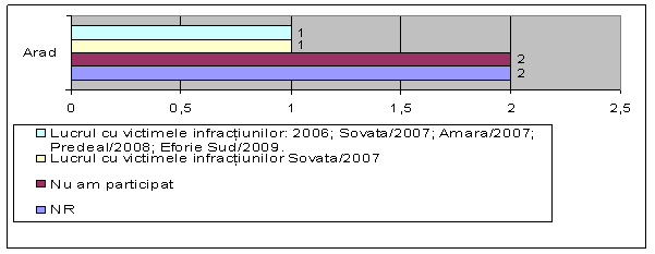 - consilierii de probatiune din serviciul de probatiune Arad au declarat urmatoarele: un consilier de probatiune a participat incepand cu anul 2006 pana in anul 2009 la cursul "Lucrul cu victimele infractiunilor", un alt consilier a declarat faptul ca a participat in anul 2007 la cursul "Lucrul cu victimele infractiunilor Sovata", 2 consilieri nu au participat la cursuri de formare si perfectionare profesionala, alti doi consilieri au bifat raspunsul "NR".