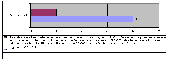 - din cei cinci consilieri de probatiune din Mehedinti unul singur a participat la programe de formare si perfectionare profesionala, astfel in anul 2004 acesta a participat la programul "Justitie restaurativa si aspecte de victimologie", in anul 2005 a participat la programul "Dezvoltarea si implementarea unui sistem de identificare si referire a victimelor", in anul 2006 a participat la programul "Asistenta victimelor infractiunilor in SUA si Romania", in anul 2008 consilierul de probatiune a mers intr-o vizita de lucru in Marea Britanie. Restul de 4 consilieri au declarat faptul ca nu au participat pana in prezent la cursuri de formare si perfectionare profesionala.