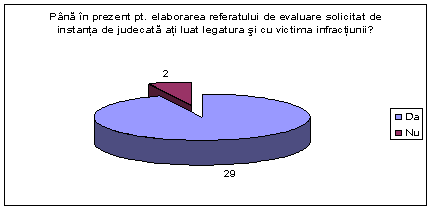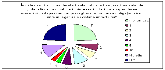 - consilierii de probatiune din serviciul de probatiune Bucuresti prezinta urmatoarele raspunsuri: 6 consilieri au bifat in chestionar raspunsul "nu stiu", 5 consilieri au declarat faptul ca nu au participat la cursuri de formare si perfectionare profesionala in ceea ce priveste victimele infractiunilor, 2 consilieri au bifat raspunsul "NR", un singur consilier declara ca a participat in anul 2005 la cursul "Asistenta traficului de fiinte umane", un alt consilier a declarat faptul ca a participat in anul 2008 la cursurile "Atasament si trauma" si "Interviul motivational".