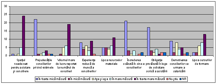 In ce masura victimele infractiunilor aflate in asistarea si consilierea serviciului dvs. se confrunta cu urmatoarele probleme? In ce masura considerati ca urmatoarele aspecte determina probleme in desfasurarea activitatii de asistare si consiliere a victimelor infractiunilor in serviciul dvs.? |